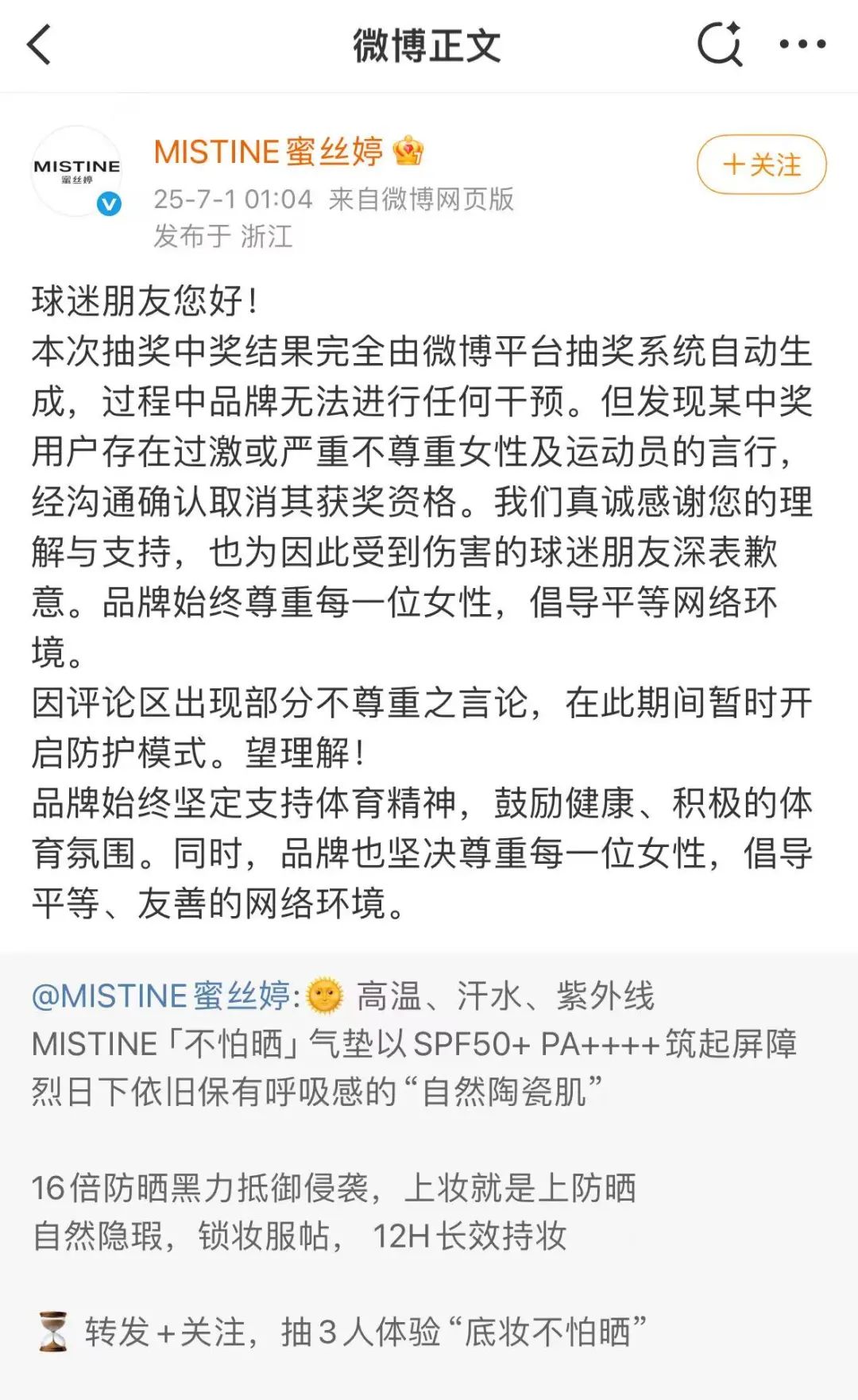 7月1日,蜜丝婷于官方微博致歉称:“本次抽奖中奖结果完全由微博平台抽奖系统自动生成,过程中品牌无法进行任何干预。但发现某中奖用户存在过激或严重不尊重女性及运动员的言行,经沟通确认取消其获奖资格。我们真诚感谢您的理解与支持,也为因此受到伤害的球迷朋友深表歉意。”